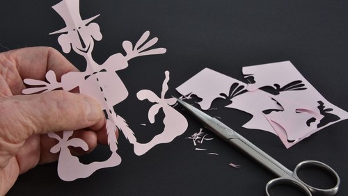 Han viser også en lang række eksempler på sine egne papirklipuniverser, som alle har deres eget særegne udtryk, materialevalg, størrelse og klippeteknik.